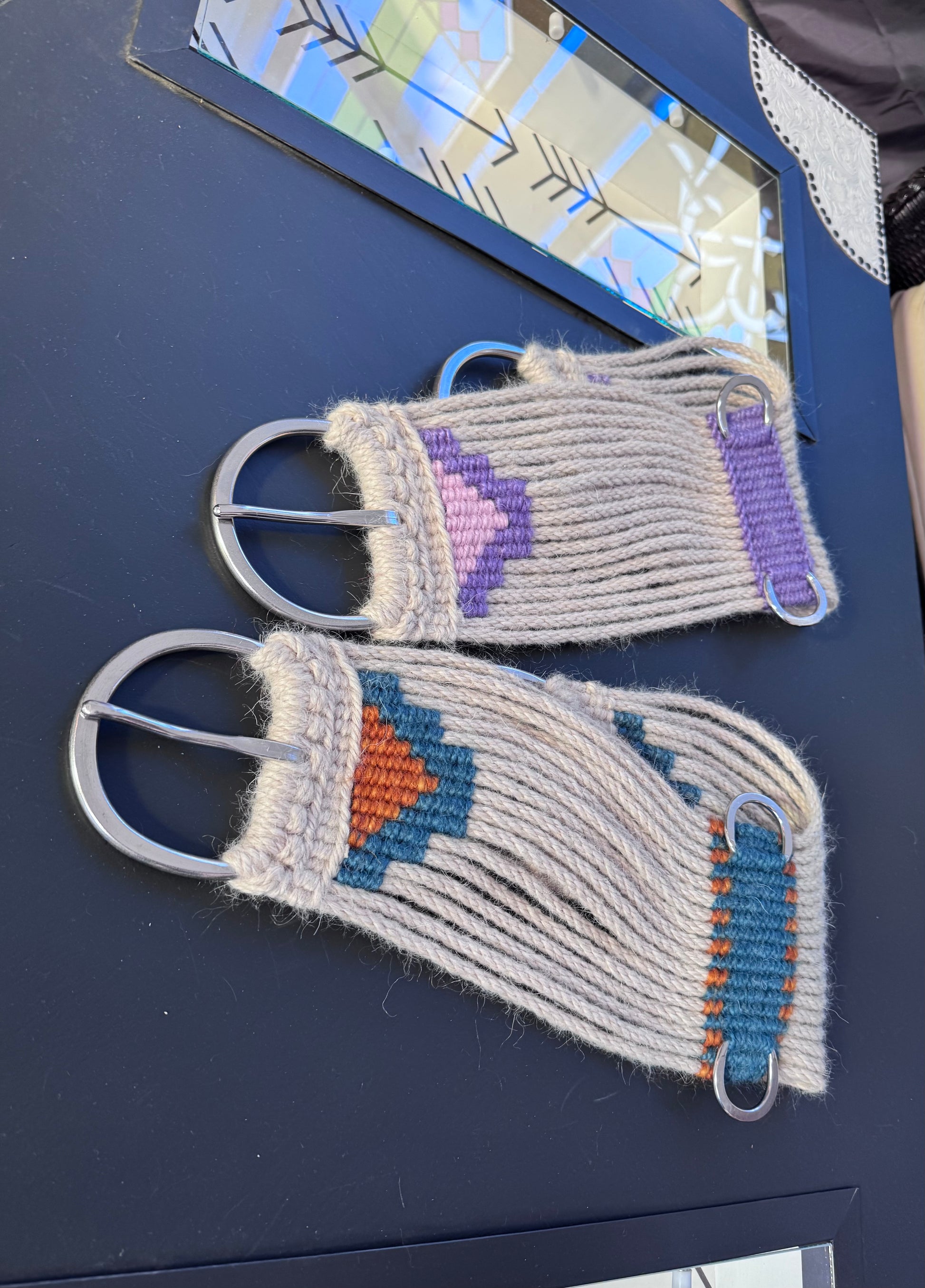 28-inch 17-strand straight cinch tied in 100% natural mohair with a woven center, detailing in lavender and light pink. Standard stainless steel hardware.