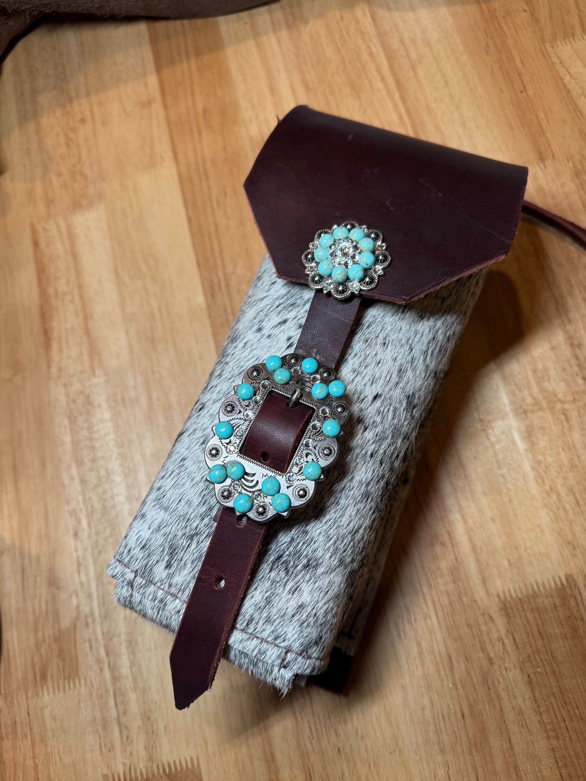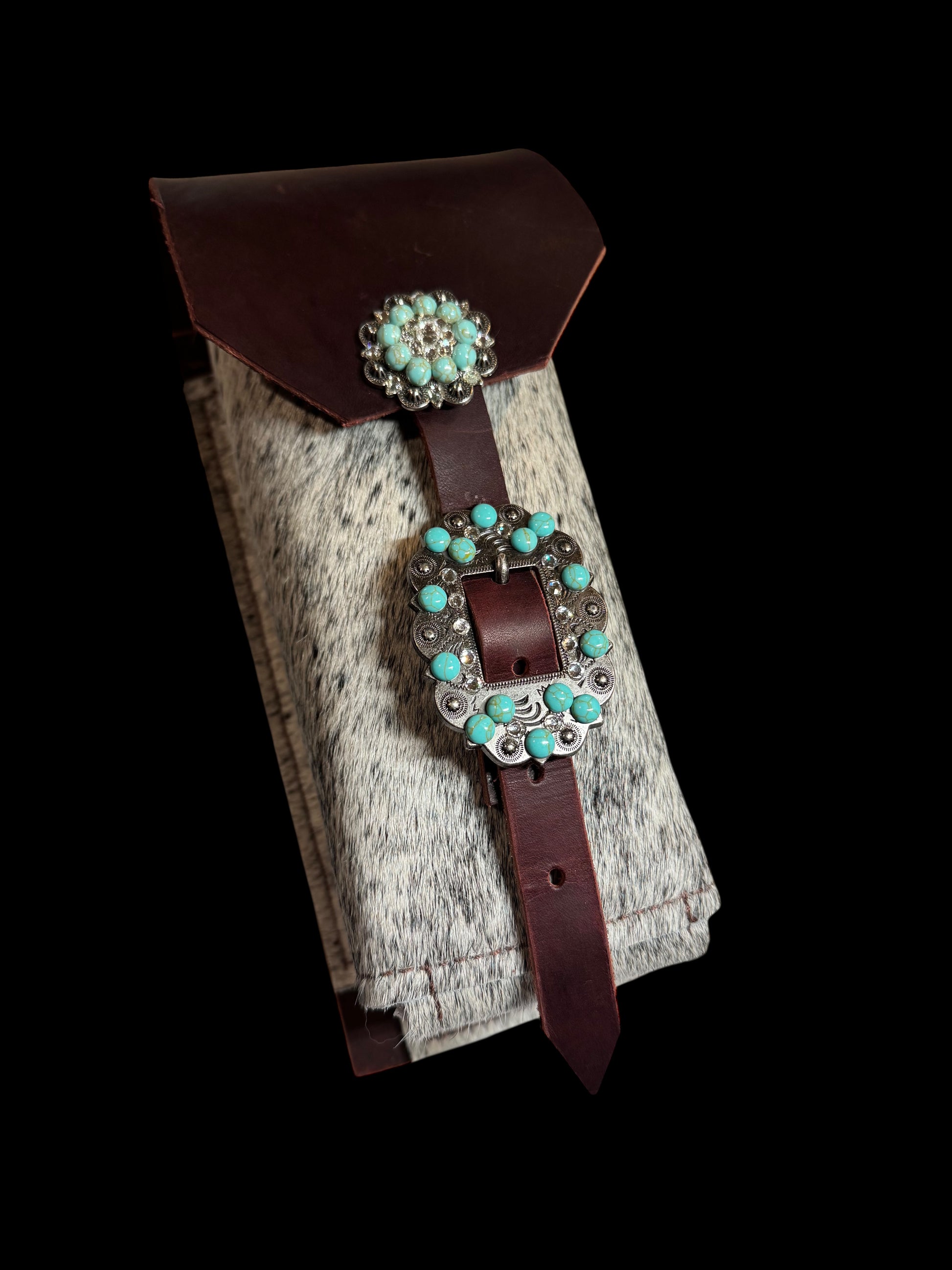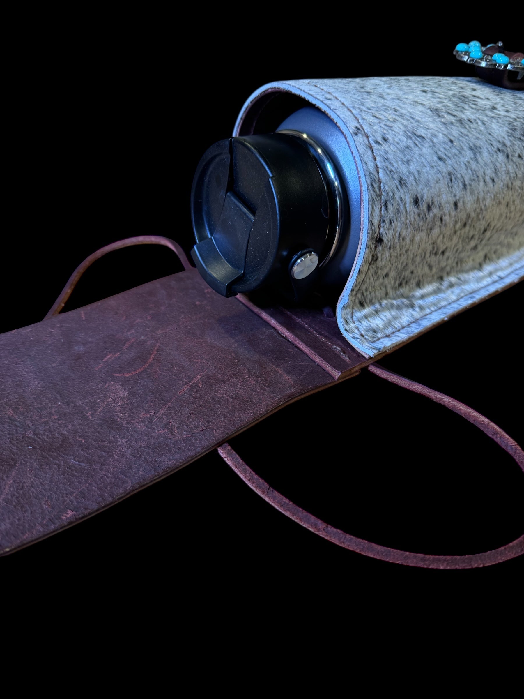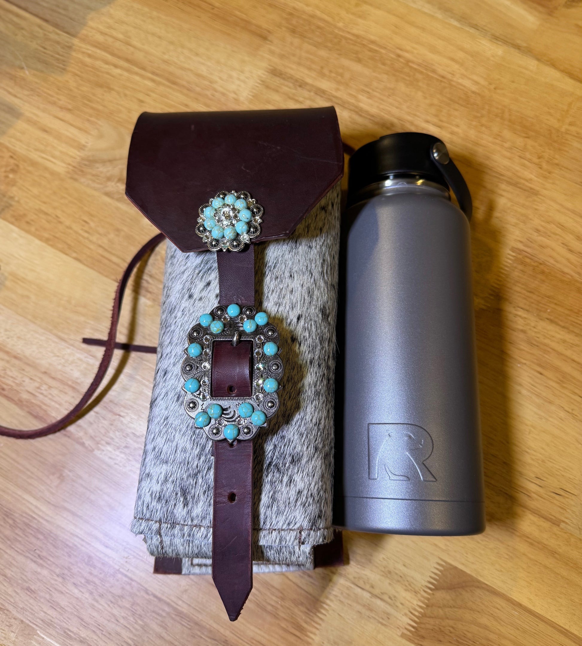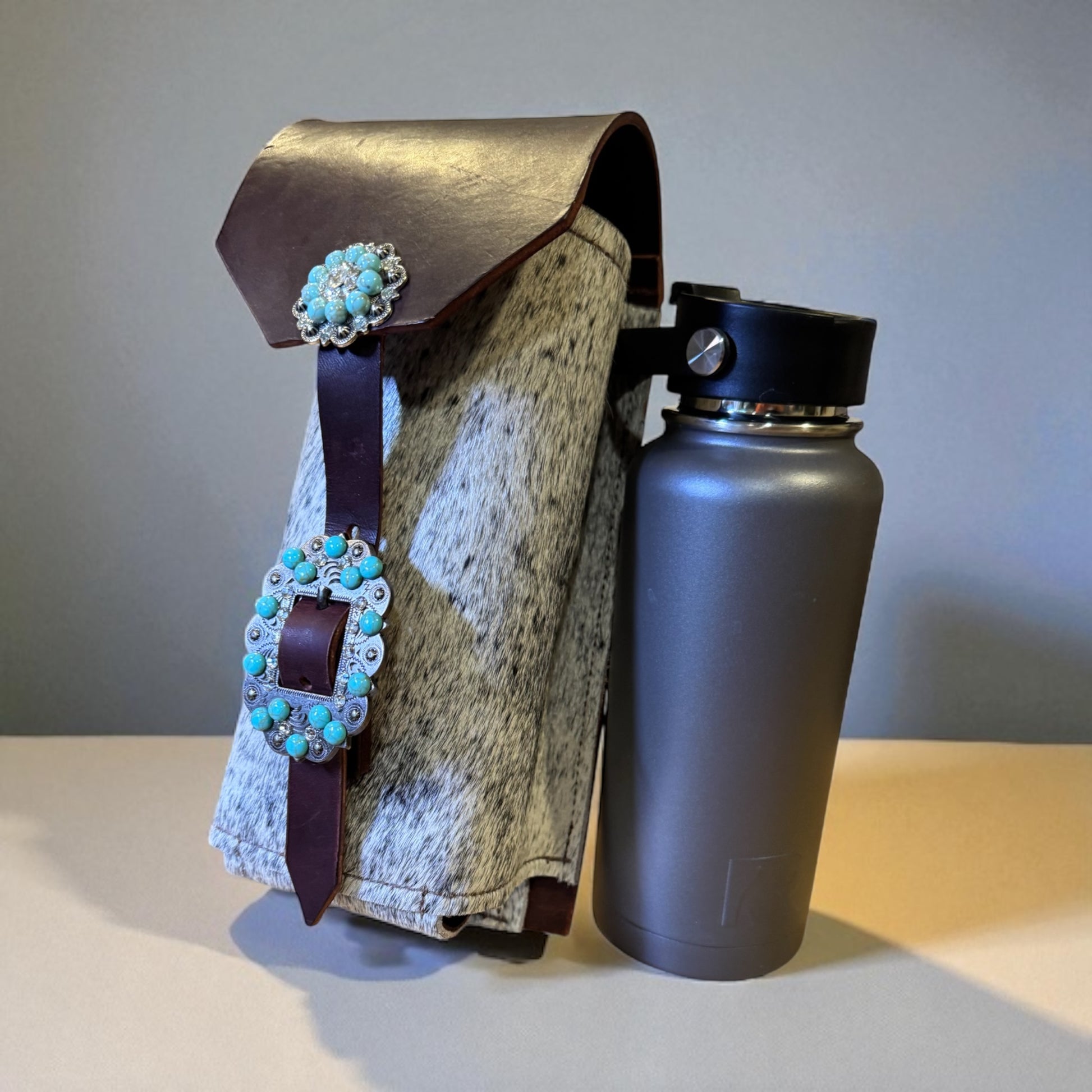 Fits most 32 oz insulated water bottles, two 16 oz water bottles or a 1.75 of your favorite beverage . Comes with a stunning turquoise concho and buckle for some added bling.