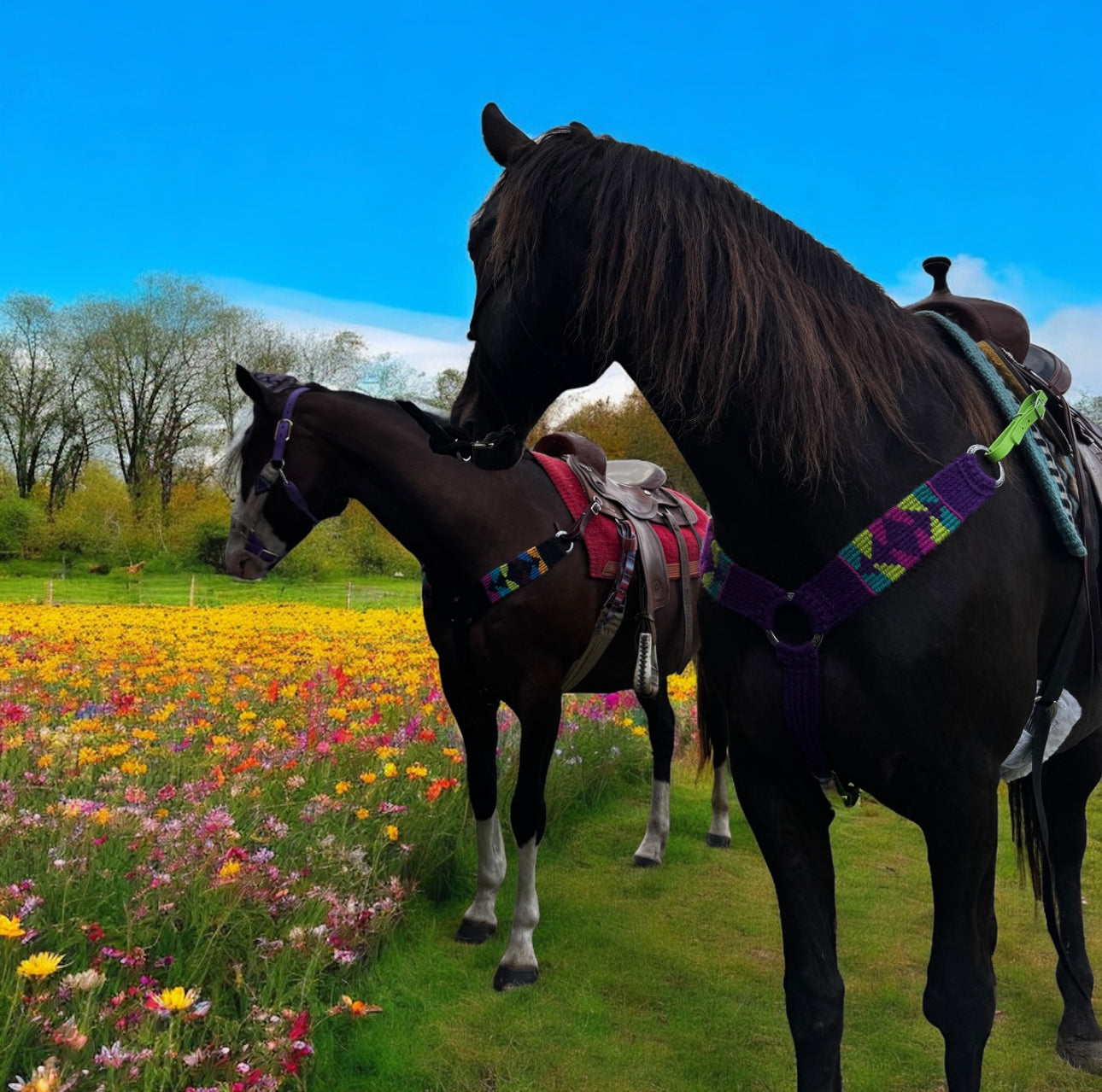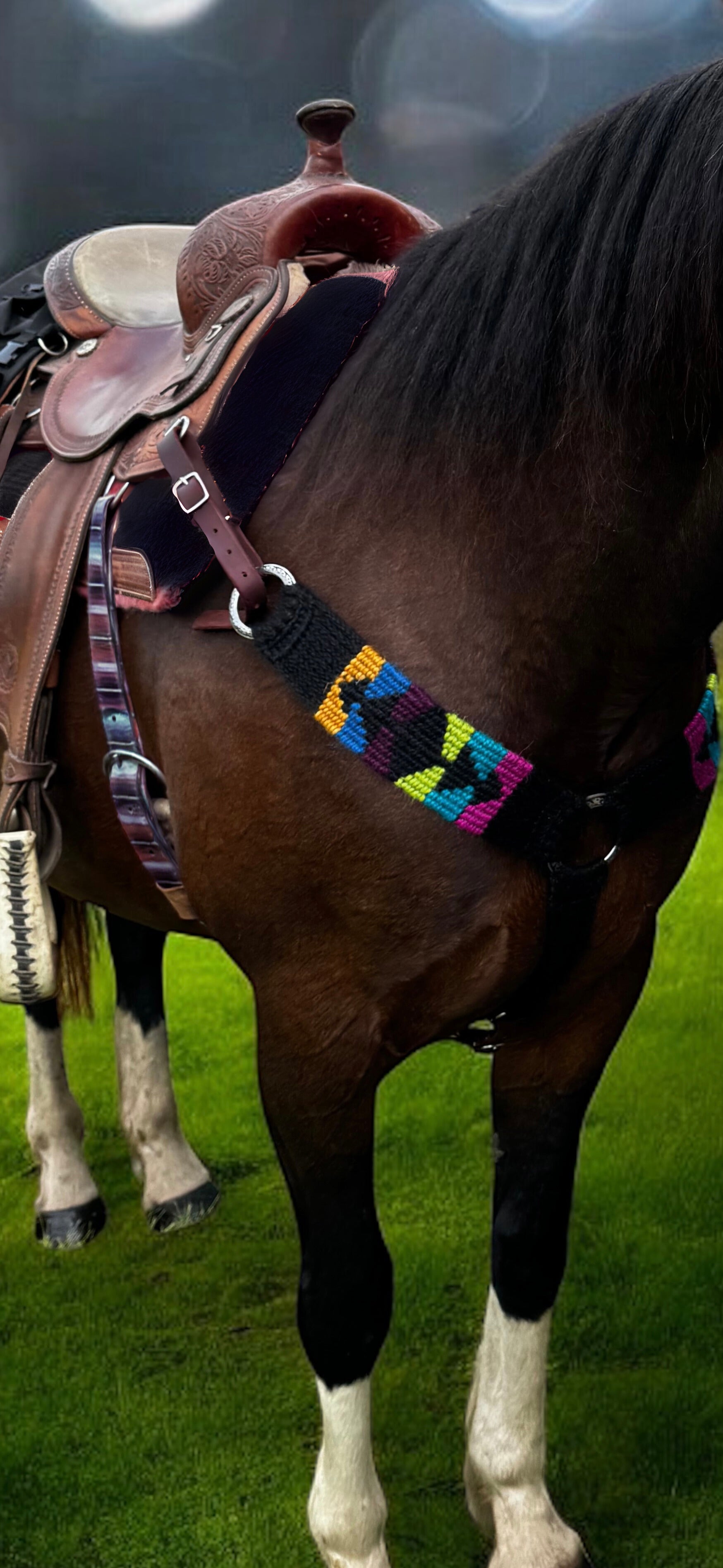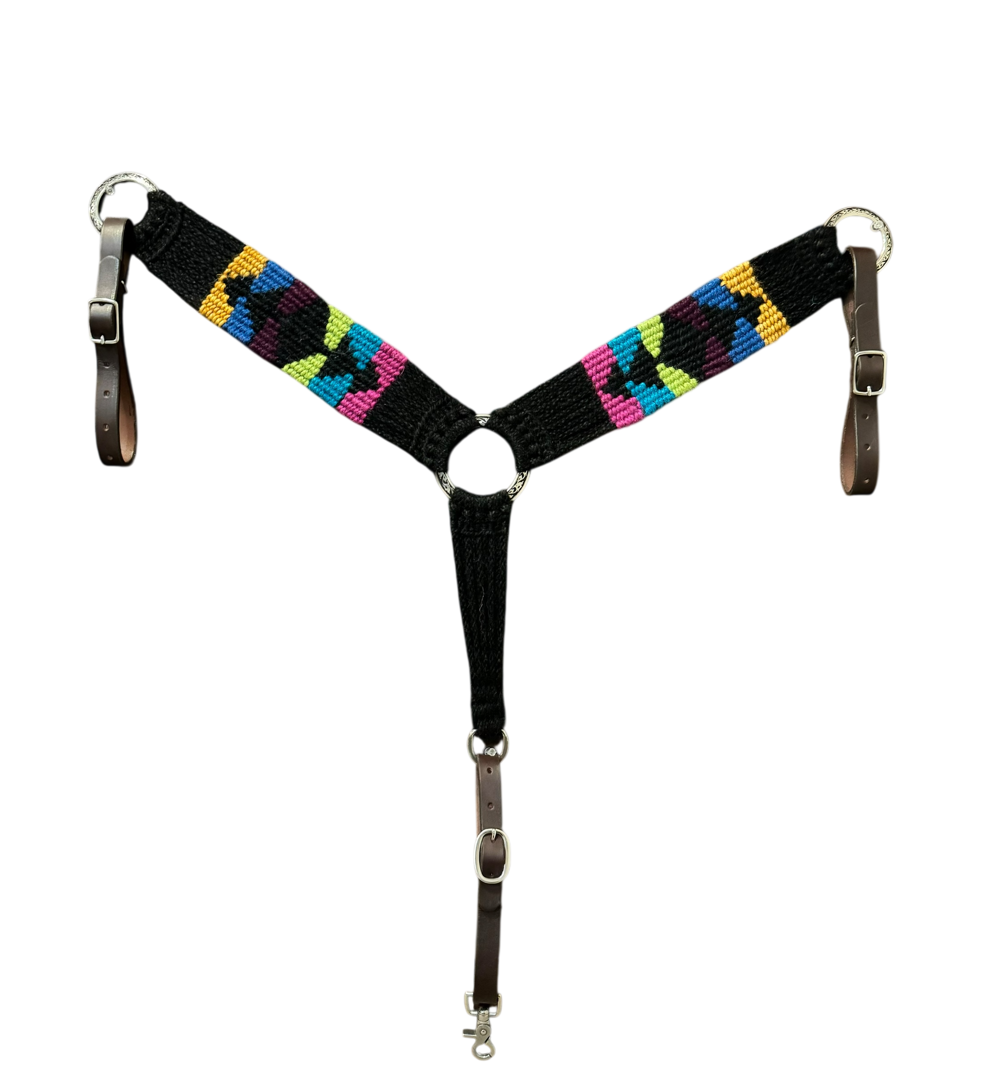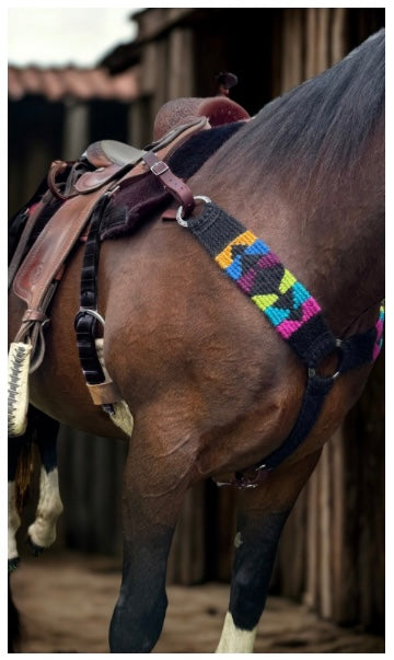 Kaleidoscopic Bliss is a vibrant mohair breast collar featuring jewel tones on a black base. Not only is this mohair breast collar beautiful to look at, but it is as tough as the jobs you and your horse will perform in it. Turning barrels, roping calves, or navigating switchbacks, there’s no reason you can’t get gritty but ride pretty.