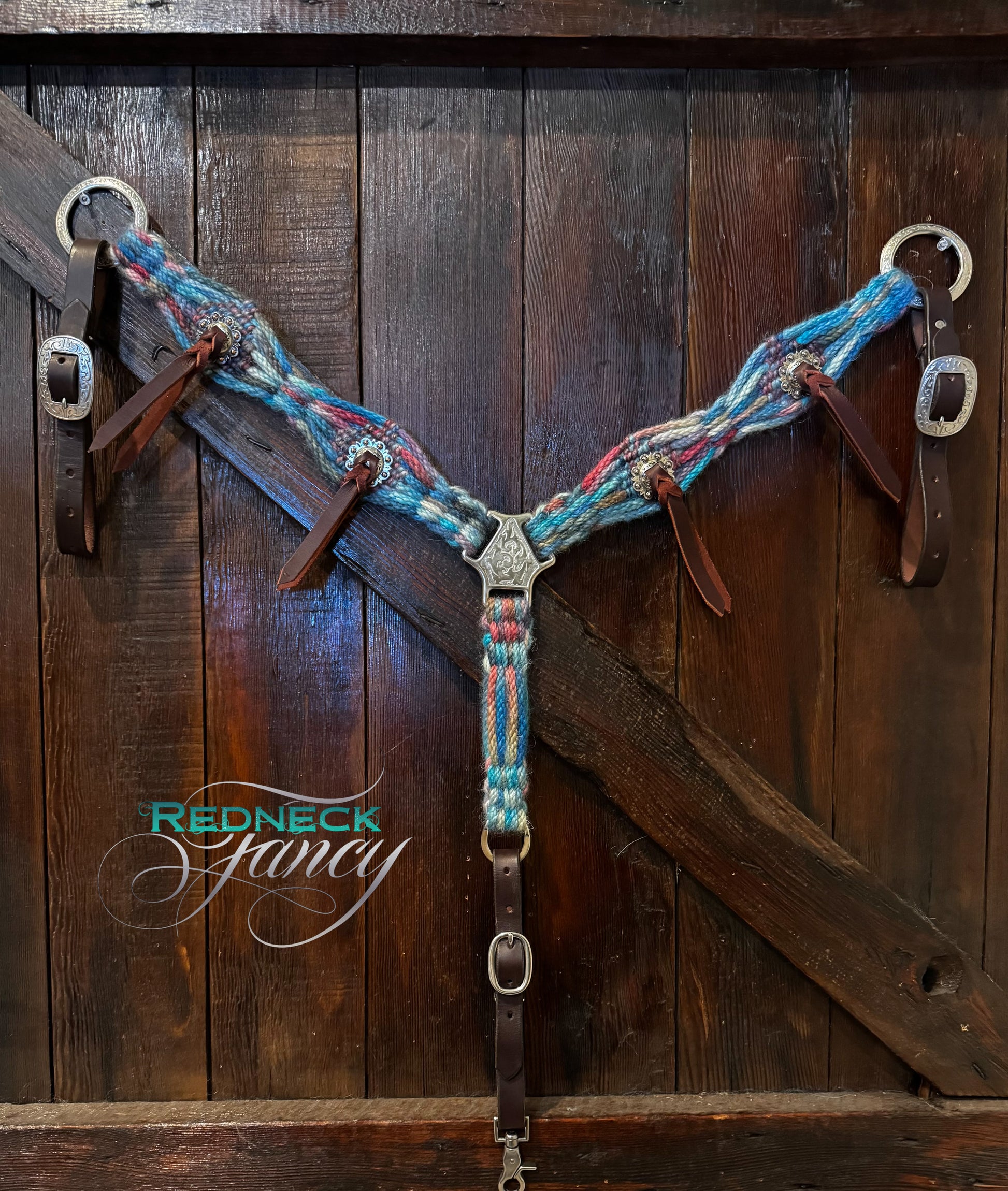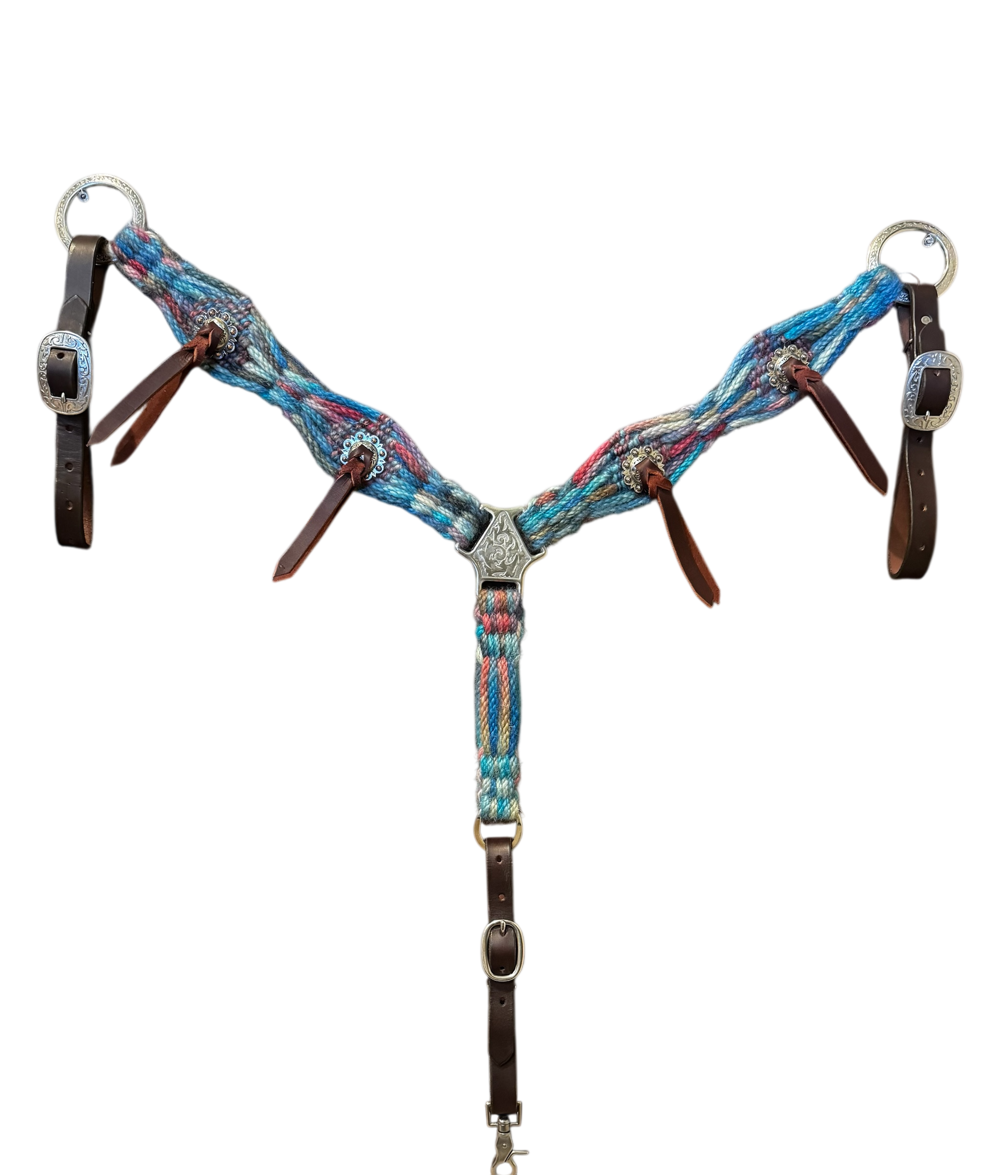 Gorgeous tie-dye mohair embellished with antique silver conchos. Whether under the arena lights or riding the trails, get gritty and ride pretty in this woven mohair breast collar.